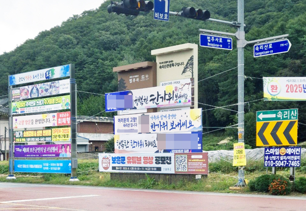 º¸Àº±º ¼Ó¸®»ê¸é »óÆÇ»ï°Å¸®¿¡ ¼³Ä¡µÈ °ü±¤ ¾È³»ÆÇÀÌ Á¤Ä¡ÀεéÀÇ Çö¼ö¸·À¸·Î °¡·ÁÁ® °ü±¤°´µéÀÇ ´«»ìÀ» ÂîǪ¸®°Ô Çϰí ÀÖ´Ù.
