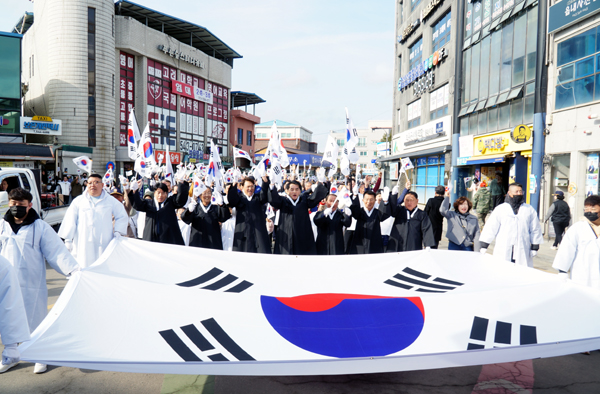 Á¦107ÁÖ³â 3¡¤1ÀýÀÎ 1ÀÏ, º¸ÀºÀ¾ µµ½É¿¡¼ űر⸦ ¾Õ¼¼¿î ´ë±Ô¸ð °Å¸®ÇàÁøÀÌ ÆîÃÄÁ³´Ù. °Å¸®ÇàÁøÀº À̳¯ ¿ÀÀü 10½Ã ´ëÇü Å¡¦