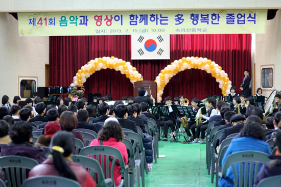 À̳¯ ÇÏ·ç, ¼Ó¸®»ê ÁßÇб³ÀÇ Á¹¾÷½ÄÀº Á¹¾÷»ýµé »Ó¸¸ ¾Æ´Ï¶ó ÀçÇлý°ú °¡Á·µé, ³»ºóµé±îÁö ¸ðµÎ ÇÔ²² Áñ±æ ¼ö ÀÖ´Â ÀÛÀº À½¾Çȸ °°Àº ºÐÀ§±â¸¦ ¿¬ÃâÇϸç, ¸» ±×´ë·Î ¿µ»ó°ú À½¾ÇÀÌ ¾î¿ì·¯Áø ¸ðµÎ°¡ ÇູÇÒ ¼ö ÀÖ´Â ¸ÚÁø Á¹¾÷½ÄÀ» ¿¬ÃâÇØ ³Â´Ù.
