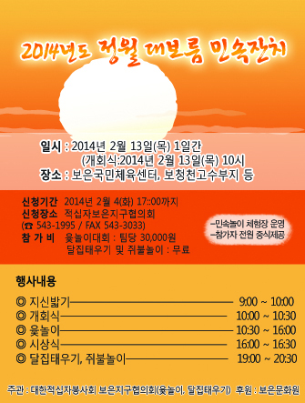 À̳¯ ¿ÀÀü 9½ÃºÎÅÍ ¿­¸®´Â '2014 Á¤¿ù´ëº¸¸§ ¹Î¼ÓÀÜÄ¡'´Â º¸Àº±ºÇ³¹°¿¬ÇÕȸÀÇ Áö½Å¹â±â¸¦ ½ÃÀÛÀ¸·Î ¿ÀÀü 10½Ã °³È¸½Ä¿¡ ÀÌ¾î ¿ì¸®¹ÎÁ· °íÀ¯ÀÇ ¼¼½Ãdz¼Ó ³îÀÌÀÎ À·³îÀÌ ´ëȸ·Î ÆîÃÄÁø´Ù.