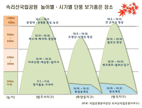 À̳¯ °ø¿ø»ç¹«¼ÒÀÇ ¹ßÇ¥¿¡ µû¸£¸é ¼Ó¸®»ê±¹¸³°ø¿øÀÇ ÃÖ°íºÀÀΠõ¿ÕºÀ(1,058m)°ú ¹®Àå´ë(1,054m) Á¤»ó¿¡¼­´Â 11ÀÏ °æ¿¡, »óȯ¾Ï ÁÖº¯ÀÇ ÇмҴë(680m)¿Í »ó°í¾Ï ÁÖº¯ÀÇ ¹è¼®´ë(890m), °æ¾÷´ë(860m) ÀÏ¿ø¿¡´Â 12ÀϺÎÅÍ 18Àϰ濡´Â ´ÜdzÀÌ µé °ÍÀ¸·Î ¿¹ÃøÇß´Ù.
