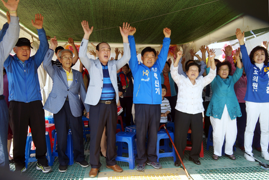 ´õºÒ¾î¹ÎÁÖ´ç ¹ÚÁø±â ±ºÀÇ¿ø È帰¡ 26ÀÏ °³¼Ò½Ä¿¡¼­ ÁöÁöÀÚµé°ú ÇÔ²² È­ÀÌÆÃÀ» ¿ÜÄ¡°í ÀÖ´Ù.