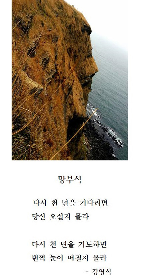 ¼ö»óÀÛÀº '¸ÁºÎ¼®'ÀÌ´Ù. ´ç¼±ÀÛÀº »ç¶÷ÀÇ ¾ó±¼Ã³·³ »ý±ä ¹ÙÀ§°¡ ¸Õ¹Ù´Ù¸¦ ¹Ù¶óº¸´Â µíÇÑ »çÁø¿¡´Ù <´Ù½Ã õ ³âÀ» ±â´Ù¸®¸é/´ç½Å ¿À½ÇÁö ¸ô¶ó//´Ù½Ã õ ³âÀ» ±âµµÇϸé/¹øÂ½ ´«ÀÌ ¶°ÁúÁö ¸ô¶ó>¶ó°í ª°Ô ¹®ÀåÀ» ½á³ÖÀº ÀÛǰÀÌ´Ù.