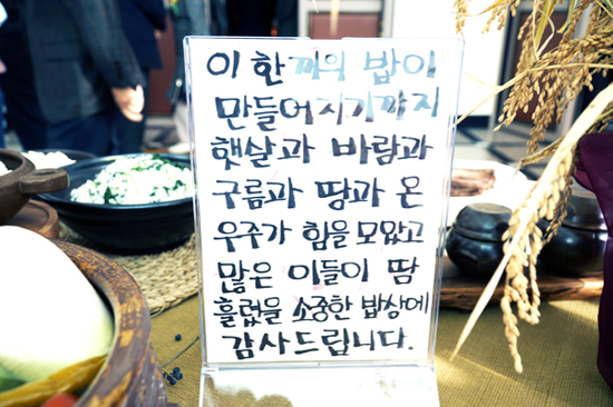 ±× ÇѰ¡¿îµ¥ "ÀÌ ÇÑ ³¢ÀÇ ¹äÀÌ ¸¸µé¾îÁö±â±îÁö ÇÞ»ì°ú ¹Ù¶÷°ú ±¸¸§°ú ¶¥°ú ¿Â ¿ìÁÖ°¡ ÈûÀ» ¸ð¾Ò°í, ¸¹Àº À̵éÀÌ ¶¡ Èê·ÈÀ» ¼ÒÁßÇÑ ¹ä»ó¿¡ °¨»çµå¸³´Ï´Ù"¶ó´Â ¹®±¸°¡ ¿Ã ÇÑÇØ ³ó¹ÎµéÀÇ ¼ö°í¿¡ °¨»çÇÏ´Â ¸¶À½À» ´Ù½Ã »ó±â½ÃŰ´Â °¨µ¿ÀÇ ¸Þ½ÃÁö·Î ´Ù°¡¿Ô´Ù.