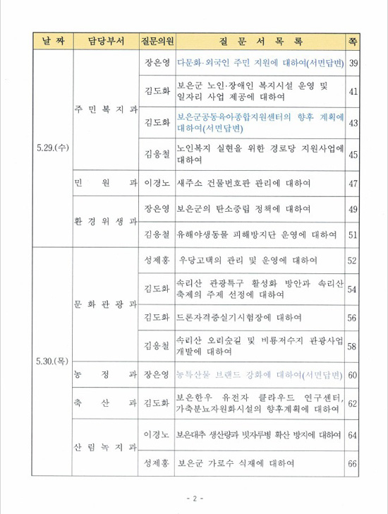¹Ú±âº´ ÀÚÄ¡ÇàÁ¤±¹ÀåÀ» »ó´ë·Î´Â ÀåÀº¿µ ÀÇ¿øÀÌ '»çȸº¹Áö»ç¾÷ºÐ¾ß ¹Î°£ À§Å¹'¿¡ ´ëÇØ, ¼ºÁ¦È« ÀÇ¿øÀÌ 'Á¤ÀÌǰ¼Û º¸Á¸°ú Á¤ÀÌǰ¼Û ÀÚ¸ñ'¿¡ ´ëÇØ, ±èµµÈ­ ÀÇ¿øÀÌ 'º¸Àº±º ±³Åëü°è °³¼± ¹æ¾È'¿¡ ´ëÇØ, À±´ë¼º ÀÇ¿øÀÌ '°ø°ø½Ã¼³¹°ÀÇ È¿À²Àû °ü¸®'¿¡ ´ëÇØ Áú¹®ÇÑ´Ù.