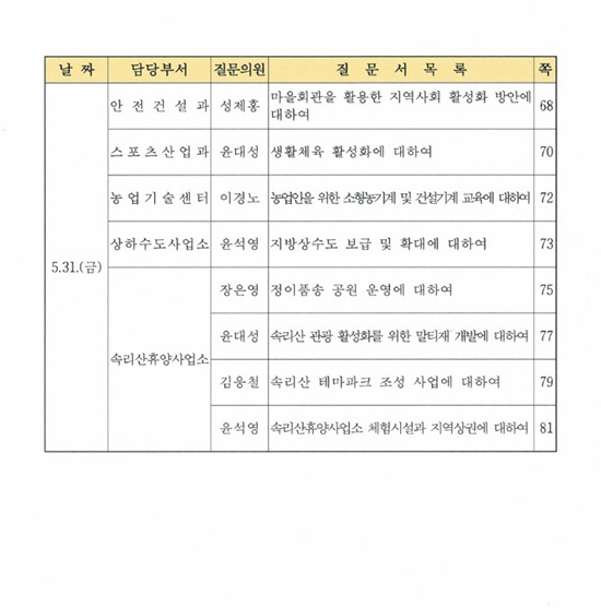 À̾î À̰æ³ë ÀÇ¿øÀº ¾È³²È£ ºÎ±º¼ö¸¦ »ó´ë·Î '°ø°ø½Ã¼³ °³¼³ ¹× È«º¸°Ô½Ã ¹æ¹ý'¿¡ ´ëÇØ, ÀåÀº¿µ ÀÇ¿øÀº '°ø°ø½É¾ß ¾à±¹ ¿î¿µ'¿¡ ´ëÇØ, ±èµµÈ­ ÀÇ¿øÀº '°¢Á¾ ÃàÁ¦ µîÀÇ Çà»ç¿¡ ¹Ýº¹ÀûÀ¸·Î ¼³Ä¡µÇ´Â ½Ã¼³¹°'°ú '¿À¼ÛÄÁº¥¼Ç°ú ¿¬°èÇÑ °ü±¤°´ À¯Ä¡ ¹æ¾È'¿¡ ´ëÇØ, À±¼®¿µ ÀÇ¿øÀº '´ëûȣ °ü±¤»ê¾÷ ¹× Áö¿ª°æÁ¦ Ȱ¼ºÈ­'¿¡ ´ëÇØ °¢°¢ Áú¹®ÇÑ´Ù..