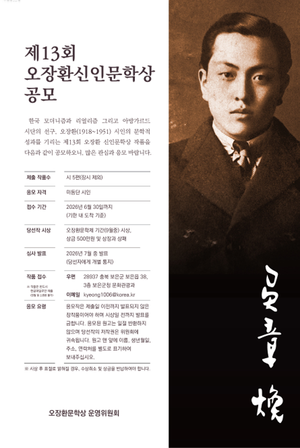 À̹ø °ø¸ð´Â Çѱ¹ ¸ð´õ´ÏÁò°ú ¸®¾ó¸®Áò, ¾Æ¹æ°¡¸£µå ½Ã´ÜÀÇ ¼±±¸ÀÚ·Î Æò°¡¹Þ´Â ¿ÀÀåȯ(1918~1951) ½ÃÀÎÀÇ ¹®ÇÐ Á¤½ÅÀ» ±â¸®°í À¯¸ÁÇÑ ½ÅÀÎ ½ÃÀÎÀ» ¹ß±¼Çϱâ À§ÇØ ¸¶·ÃµÆ´Ù.